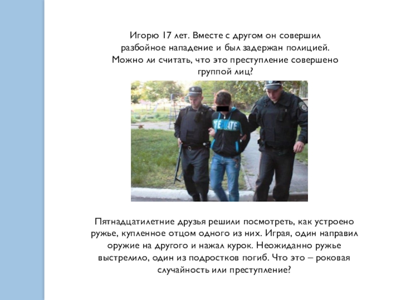 Пятнадцатилетние друзья решили посмотреть, как устроено ружье, купленное отцом одного из них. Играя, один направил оружие на другого и нажал курок. Неожиданно ружье выстрелило, один из подростков погиб. Что это – роковая случайность или преступление?