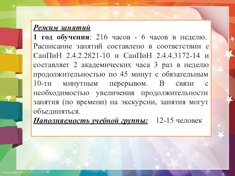 Расписание занятий составлено в соответствии с СанПиН 2.4.2.2821-10 и СанПиН 2.4.4.3172-14 и составляет 2 академических часа 3 раз в неделю продолжительностью по 45 минут с обязательным 10-ти минутным перерывом. В связи с необходимостью увеличения продолжительности занятия (по времени) на экскурсии, занятия могут объединяться.