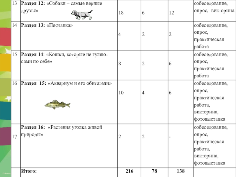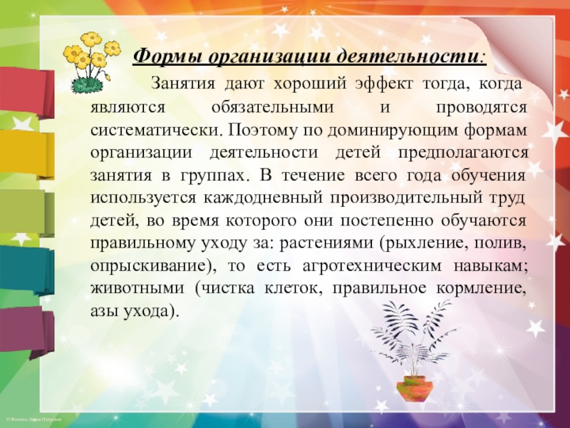 являются обязательными и проводятся систематически. Поэтому по доминирующим формам организации деятельности детей предполагаются занятия в группах. В течение всего года обучения используется каждодневный производительный труд детей, во время которого они постепенно обучаются правильному уходу за: растениями (рыхление, полив, опрыскивание), то есть агротехническим навыкам; животными (чистка клеток, правильное кормление, азы ухода).