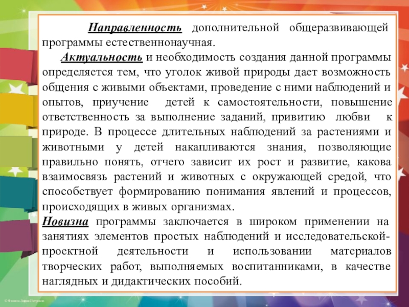Актуальность и необходимость создания данной программы определяется тем, что уголок живой природы дает возможность общения с живыми объектами, проведение с ними наблюдений и опытов, приучение детей к самостоятельности, повышение ответственность за выполнение заданий, привитию любви к природе. В процессе длительных наблюдений за растениями и животными у детей накапливаются знания, позволяющие правильно понять, отчего зависит их рост и развитие, какова взаимосвязь растений и животных с окружающей средой, что способствует формированию понимания явлений и процессов, происходящих в живых организмах.