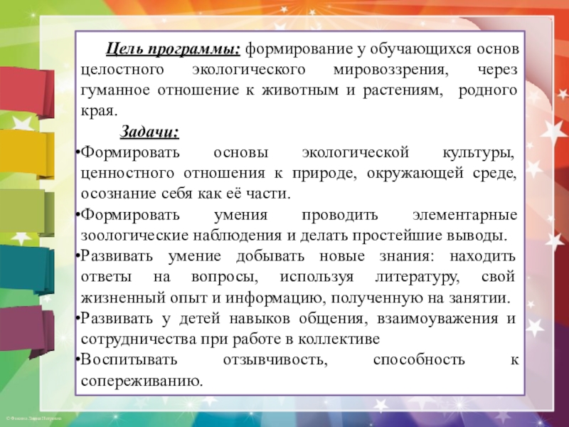 целостного экологического мировоззрения, через гуманное отношение к животным и растениям, родного края.