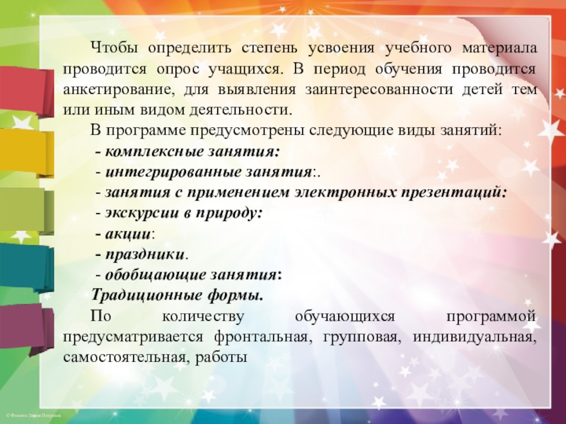 По количеству обучающихся программой предусматривается фронтальная, групповая, индивидуальная, самостоятельная, работы
