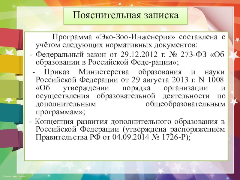 - Концепция развития дополнительного образования в Российской Федерации (утверждена распоряжением Правительства РФ от 04.09.2014 № 1726-Р);