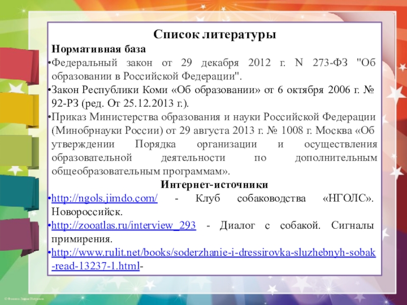 - Федеральный закон от 29.12.2012 г. № 273-ФЗ «Об образовании в Российской Феде-рации»;