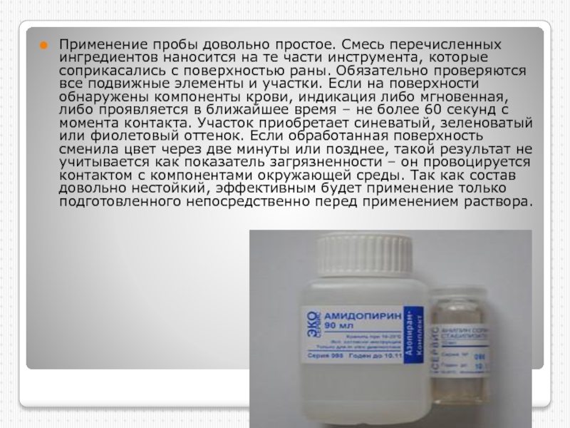 инструмента, которые соприкасались с поверхностью раны. Обязательно проверяются все подвижные элементы и участки. Если на поверхности обнаружены компоненты крови, индикация либо мгновенная, либо проявляется в ближайшее время – не более 60 секунд с момента контакта. Участок приобретает синеватый, зеленоватый или фиолетовый оттенок. Если обработанная поверхность сменила цвет через две минуты или позднее, такой результат не учитывается как показатель загрязненности – он провоцируется контактом с компонентами окружающей среды. Так как состав довольно нестойкий, эффективным будет применение только подготовленного непосредственно перед применением раствора.