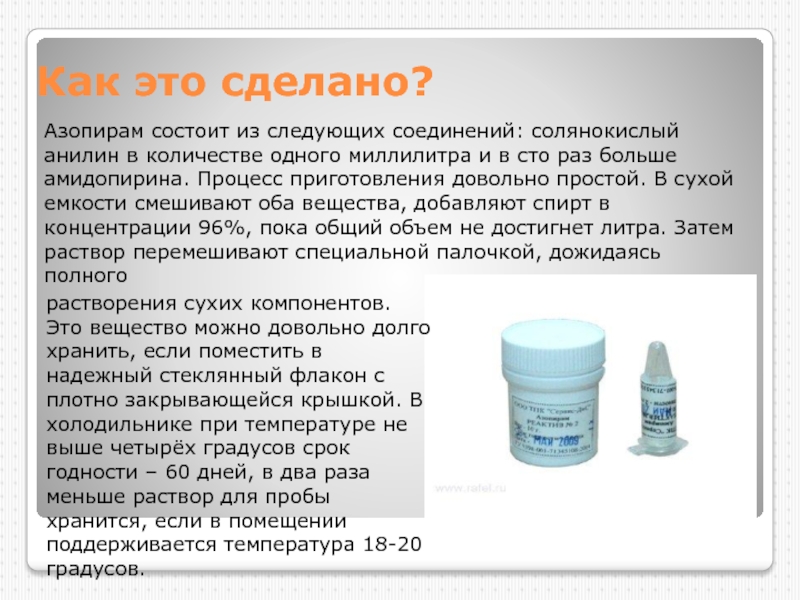 одного миллилитра и в сто раз больше амидопирина. Процесс приготовления довольно простой. В сухой емкости смешивают оба вещества, добавляют спирт в концентрации 96%, пока общий объем не достигнет литра. Затем раствор перемешивают специальной палочкой, дожидаясь полного
