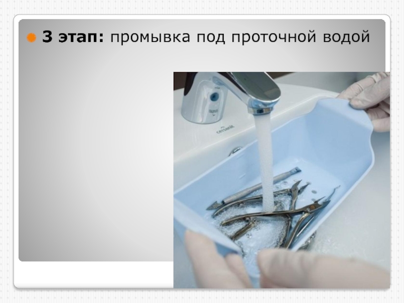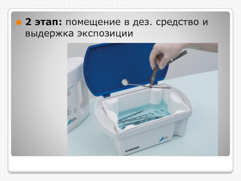 Слайд 52 этап: помещение в дез. средство и выдержка экспозиции