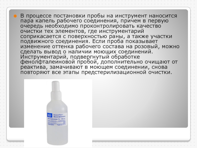 причем в первую очередь необходимо проконтролировать качество очистки тех элементов, где инструментарий соприкасается с поверхностью раны, а также участки подвижного соединения. Если проба показывает изменение оттенка рабочего состава на розовый, можно сделать вывод о наличии моющих соединений. Инструментарий, подвергнутый обработке фенолфталеиновой пробой, дополнительно очищают от реактива, замачивают в моющем соединении, снова повторяют все этапы предстерилизационной очистки.
