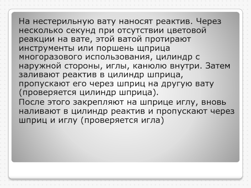 реакции на вате, этой ватой протирают инструменты или поршень щприца многоразового использования, цилиндр с наружной стороны, иглы, канюлю внутри. Затем заливают реактив в цилиндр шприца, пропускают его через шприц на другую вату (проверяется цилиндр шприца).