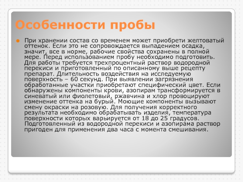 оттенок. Если это не сопровождается выпадением осадка, значит, все в норме, рабочие свойства сохранены в полной мере. Перед использованием пробу необходимо подготовить. Для работы требуется трехпроцентный раствор водородной перекиси и приготовленный по описанному выше рецепту препарат. Длительность воздействия на исследуемую поверхность – 60 секунд. При выявлении загрязнения обработанные участки приобретают специфический цвет. Если обнаружены компоненты крови, азопирам трансформируется в синеватый или фиолетовый, ржавчина и хлор провоцируют изменение оттенка на бурый. Моющие компоненты вызывают смену окраски на розовую. Для получения корректного результата необходимо обрабатывать изделия, температура поверхности которых варьируется от 18 до 25 градусов. Подготовленный из водородной перекиси и азопирама раствор пригоден для применения два часа с момента смешивания.