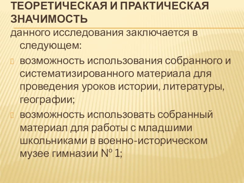 возможность использовать собранный материал для работы с младшими школьниками в военно-историческом музее гимназии № 1;