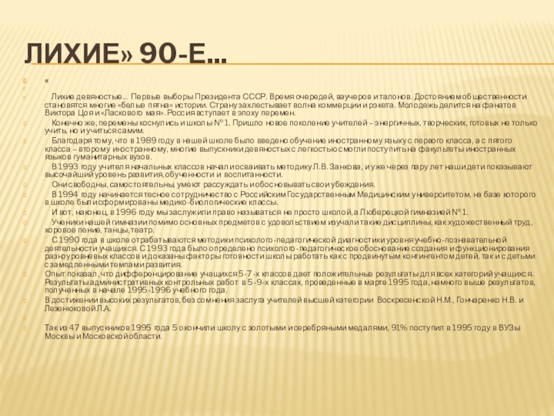 И вот, наконец, в 1996 году мы заслужили право называться не просто школой, а Люберецкой гимназией № 1.