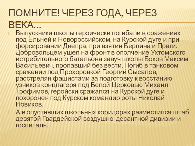 Ельней и Новороссийском, на Курской дуге и при форсировании Днепра, при взятии Берлина и Праги. Добровольцем ушел на фронт в ополчение Ухтомского истребительного батальона завуч школы Боков Максим Васильевич, пропавший без вести. Погиб в танковом сражении под Прохоровкой Георгий Сысалов, расстрелян фашистами за подготовку к восстанию узников концлагеря под Белой Церковью Михаил Трофимов, геройски сражался на Курской дуге и похоронен под Курском командир роты Николай Новиков.