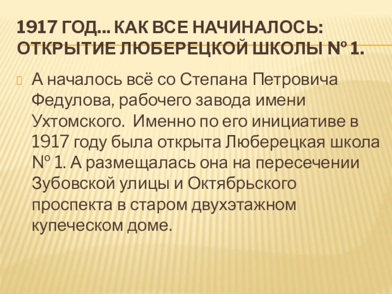 всё со Степана Петровича Федулова, рабочего завода имени Ухтомского. Именно по его инициативе в 1917 году была открыта Люберецкая школа № 1. А размещалась она на пересечении Зубовской улицы и Октябрьского проспекта в старом двухэтажном купеческом доме.