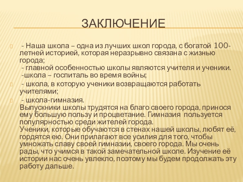 Ученики, которые обучаются в стенах нашей школы, любят её, гордятся ею. Они прилагают все усилия для того, чтобы умножать славу своей гимназии, своего города. Мы очень рады, что учимся в такой замечательной школе. Изучение её истории нас очень увлекло, поэтому мы будем продолжать эту работу дальше.