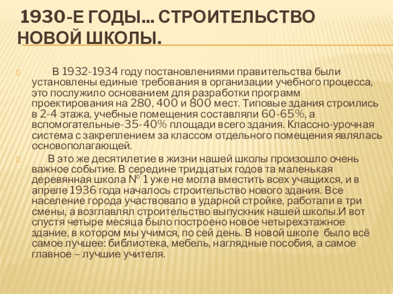В это же десятилетие в жизни нашей школы произошло очень важное событие. В середине тридцатых годов та маленькая деревянная школа № 1 уже не могла вместить всех учащихся, и в апреле 1936 года началось строительство нового здания. Все население города участвовало в ударной стройке, работали в три смены, а возглавлял строительство выпускник нашей школы.И вот спустя четыре месяца было построено новое четырехэтажное здание, в котором мы учимся, по сей день. В новой школе было всё самое лучшее: библиотека, мебель, наглядные пособия, а самое главное – лучшие учителя.