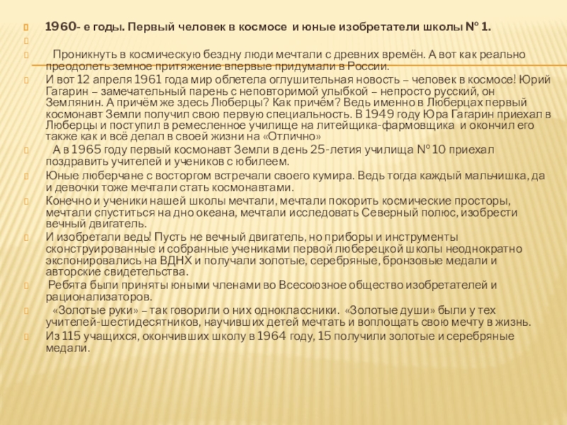 Слайд 181960- е годы. Первый человек в космосе и юные изобретатели школы