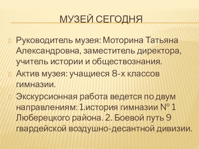 Экскурсионная работа ведется по двум направлениям: 1.история гимназии № 1 Люберецкого района. 2. Боевой путь 9 гвардейской воздушно-десантной дивизии.