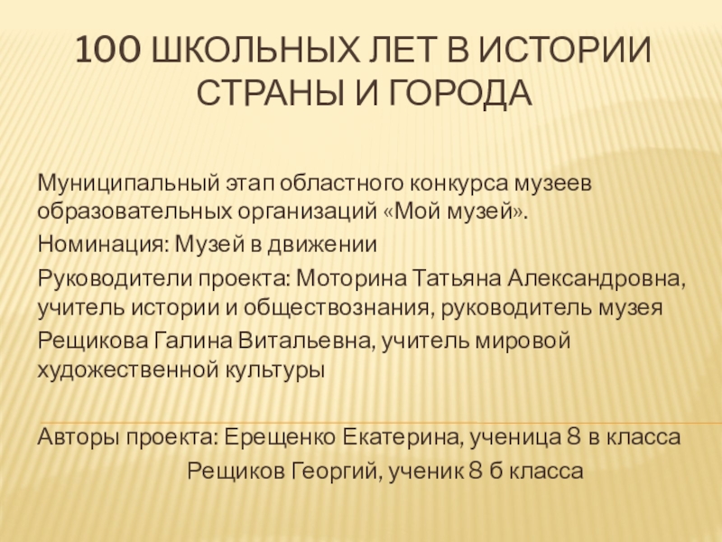 Руководители проекта: Моторина Татьяна Александровна, учитель истории и обществознания, руководитель музея