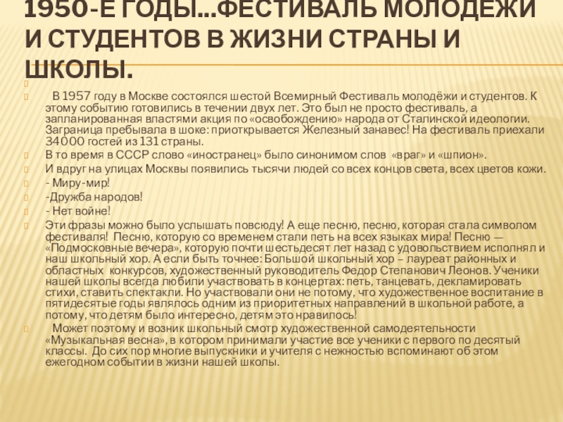 Слайд 161950-е годы...Фестиваль молодежи и студентов в жизни страны и школы.