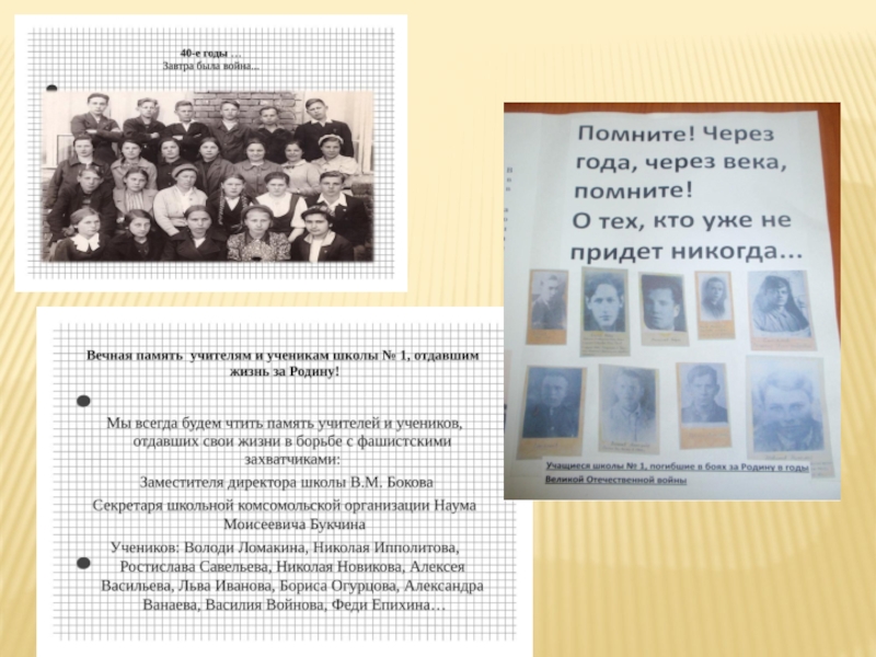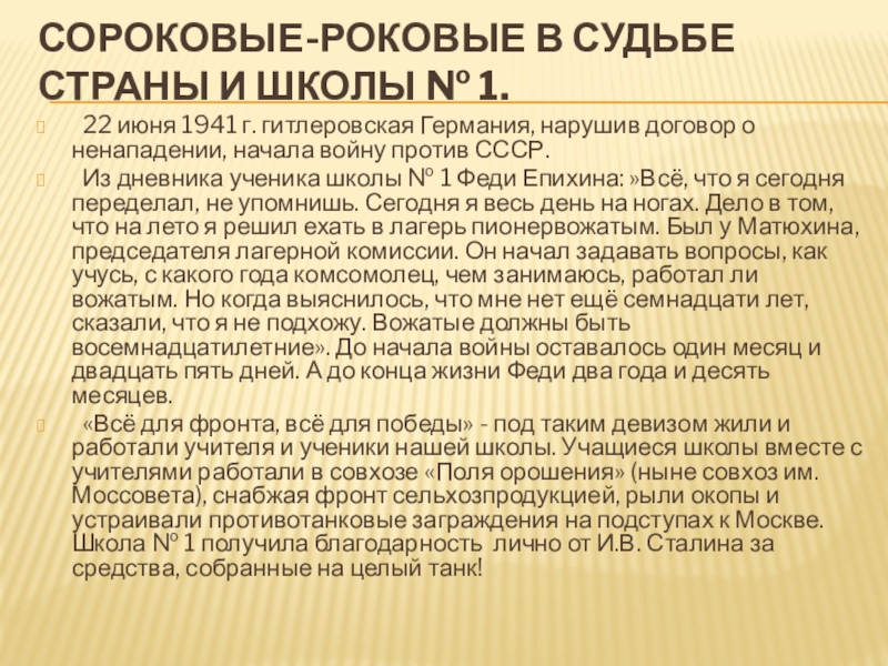 Слайд 13Сороковые-роковые в судьбе страны и школы № 1.
