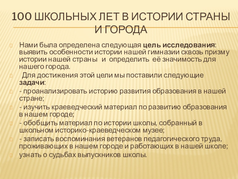 цель исследования: выявить особенности истории нашей гимназии сквозь призму истории нашей страны и определить её значимость для нашего города.