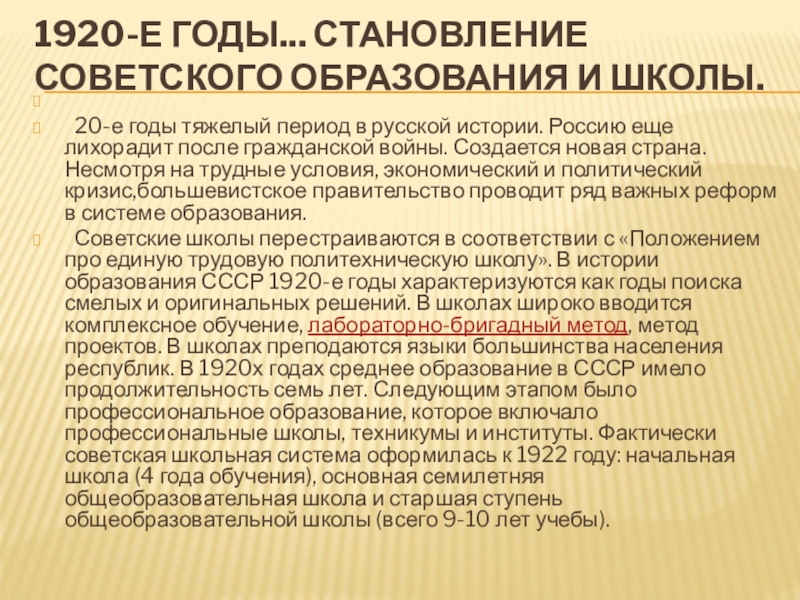 русской истории. Россию еще лихорадит после гражданской войны. Создается новая страна. Несмотря на трудные условия, экономический и политический кризис,большевистское правительство проводит ряд важных реформ в системе образования.