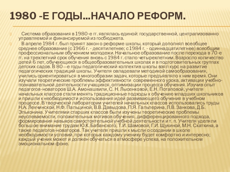 В апреле 1984 г. был принят закон о реформе школы, который дополнял всеобщее среднее образование (с 1966 г. - десятилетнее; с 1984 г. - одиннадцатилетнее) всеобщим профессиональным обучением молодежи. Начальное образование после перехода в 70-е гг. на трехлетний срок обучения вновь с 1984 г. стало четырехлетним. Возросло количество детей 6 лет, обучающихся в общеобразовательных школах и в подготовительных группах детских садов. В 80—е годы педагогический коллектив школы взял курс на развитие педагогических традиций школы. Учителя овладевали методикой самообразования, учились ориентироваться в многообразии задач, которые предъявляло к ним время. Они изучали теоретические проблемы эффективности современного урока, активации учебно-познавательной деятельности учащихся, оптимизации процесса обучения. Изучив опыт педагогов-новаторов Ш.А. Амонашвили, С. Н. Лысенковой, Е.Н. Потаповой, учителя начальных классов стали менять традиционные подходы к обучению младших школьников и пришли к необходимости использования идей развивающего обучения в учебном процессе. В творческой лаборатории учителей начальных классов использовались труды Н.А. Лекчинской, Н.Ф. Пальциной, В.В. Давыдова, П.Я. Гальперина, Л.В. Занкова, Д.Б. Эльконина. Учителями старших классов были изучены теоретические проблемы неуспеваемости, положительных мотивов обучения, дифференцированного подхода, формирования навыков самостоятельной учебной деятельности и т. п. Учителя уделяли большое внимание трудам Ю.К. Бабанского, Т.И. Шамовой, Г.И. Щукиной, М.Н. Скаткина, а также педагогов-новаторов. Так учителя пришли к мысли о создании в школе необходимости условий, при которых каждому ученику будет комфортно и интересно; каждый ученик может и должен обучаться в атмосфере успеха, на положительном эмоциональном фоне.