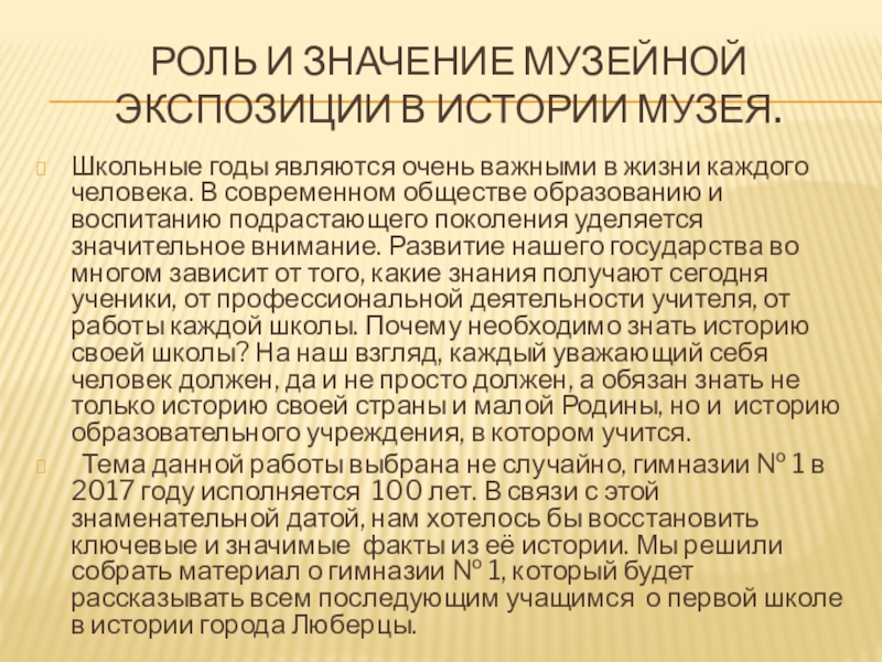 Тема данной работы выбрана не случайно, гимназии № 1 в 2017 году исполняется 100 лет. В связи с этой знаменательной датой, нам хотелось бы восстановить ключевые и значимые факты из её истории. Мы решили собрать материал о гимназии № 1, который будет рассказывать всем последующим учащимся о первой школе в истории города Люберцы.