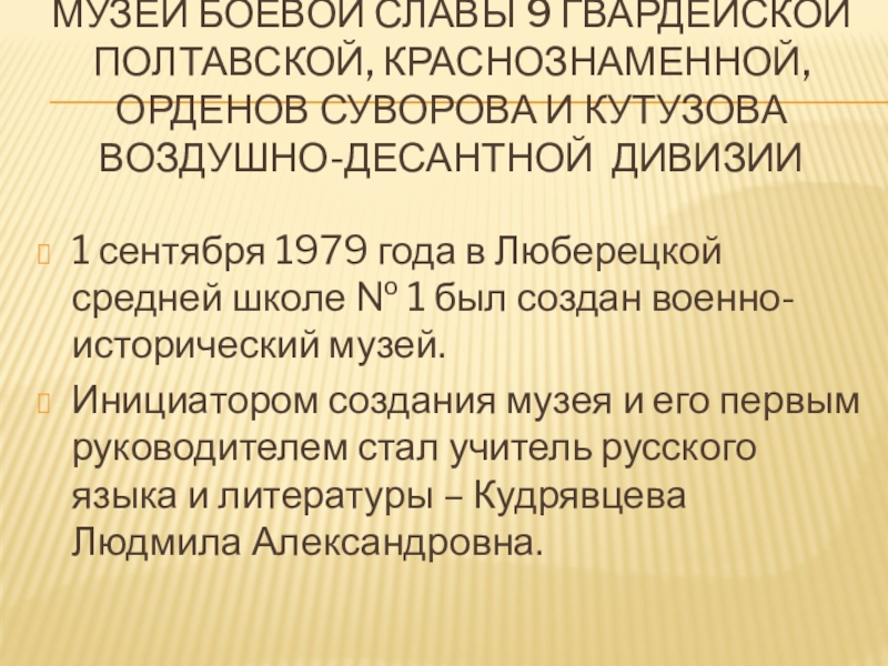 В 1979 году в школе № 1 был открыт музей боевой славы 9 гвардейской воздушно-десантной дивизии, чей штаб формировался в здании школы во время войны. Руководителем и идейным вдохновителем всех поисковых работ стала Кудрявцева Людмила Александровна, учитель русского языка и литературы.