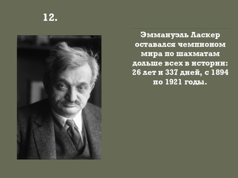 Эммануэль Ласкер оставался чемпионом мира по шахматам дольше всех в истории: