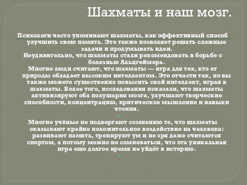 Многие люди считают, что шахматы — игра для тех, кто от природы обладает высоким интеллектом. Это отчасти так, но вы также можете существенно повысить свой интеллект, играя в шахматы. Более того, исследования показали, что шахматы активизируют оба полушария мозга, улучшают творческие способности, концентрацию, критическое мышление и навыки чтения.