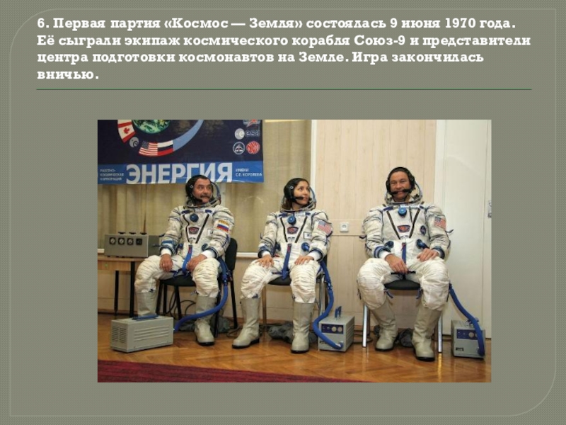 6. Первая партия «Космос — Земля» состоялась 9 июня 1970 года.
