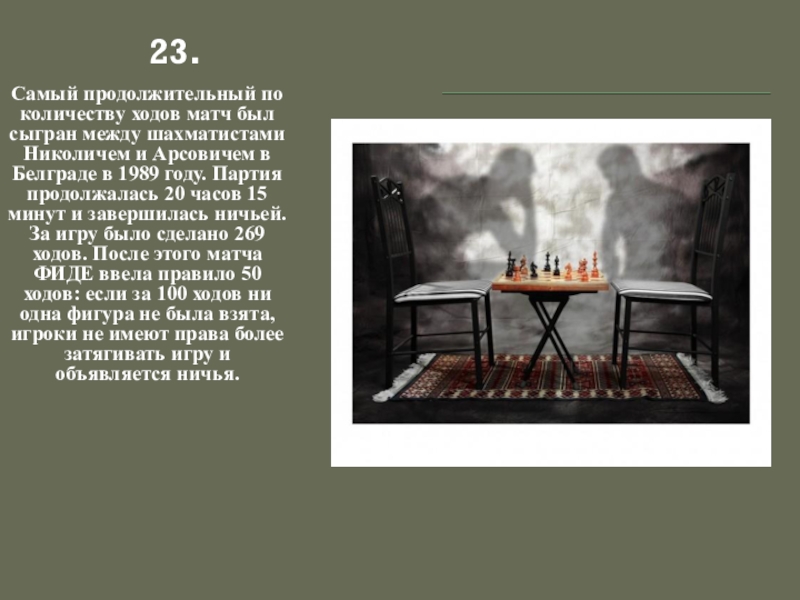 и Арсовичем в Белграде в 1989 году. Партия продолжалась 20 часов 15 минут и завершилась ничьей. За игру было сделано 269 ходов. После этого матча ФИДЕ ввела правило 50 ходов: если за 100 ходов ни одна фигура не была взята, игроки не имеют права более затягивать игру и объявляется ничья.