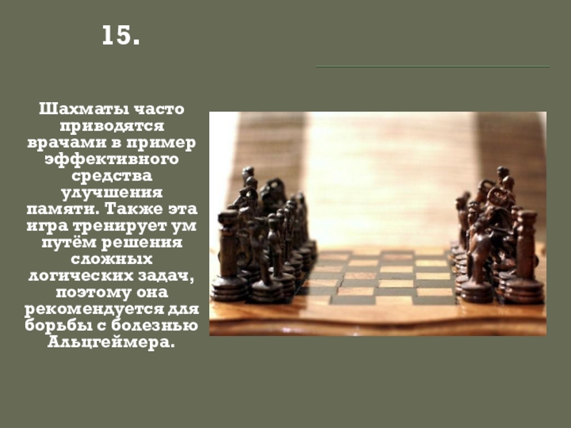 Шахматы часто приводятся врачами в пример эффективного средства улучшения памяти. Также