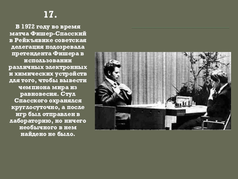 подозревала претендента Фишера в использовании различных электронных и химических устройств для того, чтобы вывести чемпиона мира из равновесия. Стул Спасского охранялся круглосуточно, а после игр был отправлен в лабораторию, но ничего необычного в нем найдено не было.
