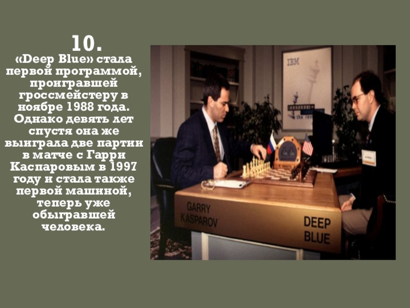«Deep Blue» стала первой программой, проигравшей гроссмейстеру в ноябре 1988 года.