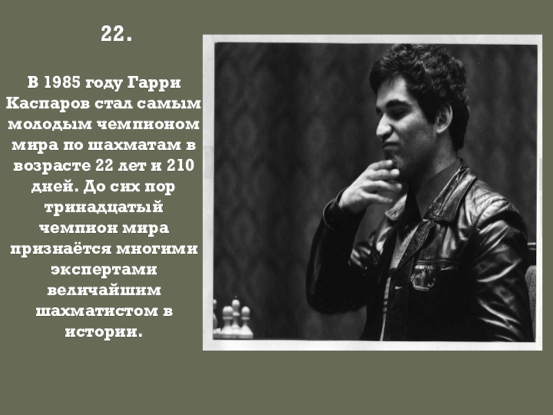 шахматам в возрасте 22 лет и 210 дней. До сих пор тринадцатый чемпион мира признаётся многими экспертами величайшим шахматистом в истории.