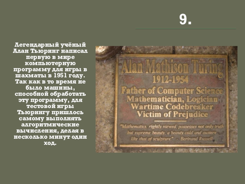 игры в шахматы в 1951 году. Так как в то время не было машины, способной обработать эту программу, для тестовой игры Тьюрингу пришлось самому выполнять алгоритмические вычисления, делая в несколько минут один ход.
