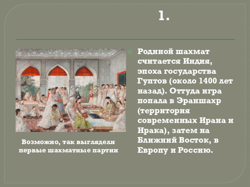 шахмат считается Индия, эпоха государства Гуптов (около 1400 лет назад). Оттуда игра попала в Эраншахр (территория современных Ирана и Ирака), затем на Ближний Восток, в Европу и Россию.