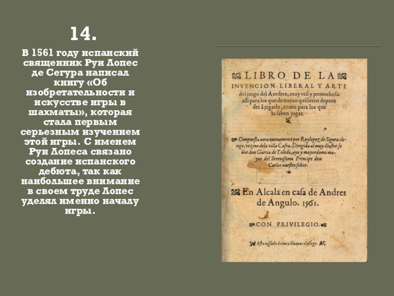 В 1561 году испанский священник Руи Лопес де Сегура написал книгу