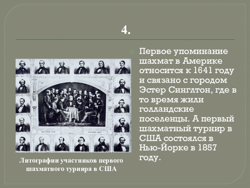 связано с городом Эстер Синглтон, где в то время жили голландские поселенцы. А первый шахматный турнир в США состоялся в Нью-Йорке в 1857 году.