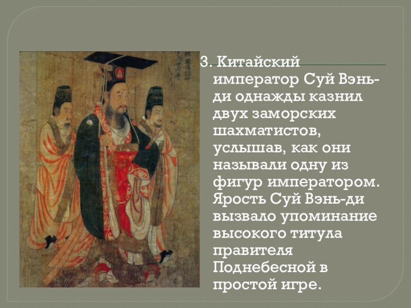 Слайд 43. Китайский император Суй Вэнь-ди однажды казнил двух заморских шахматистов, услышав,