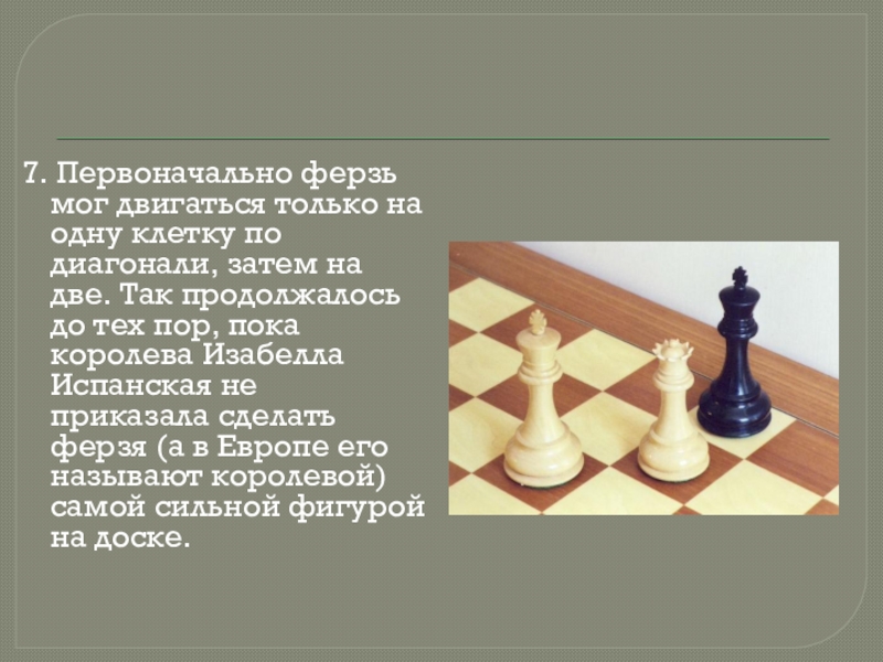 затем на две. Так продолжалось до тех пор, пока королева Изабелла Испанская не приказала сделать ферзя (а в Европе его называют королевой) самой сильной фигурой на доске.