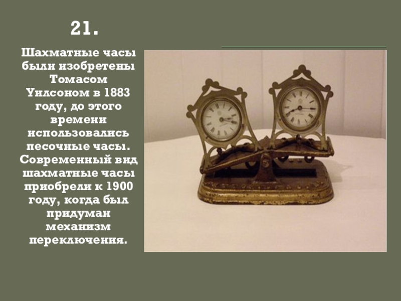Шахматные часы были изобретены Томасом Уилсоном в 1883 году, до этого