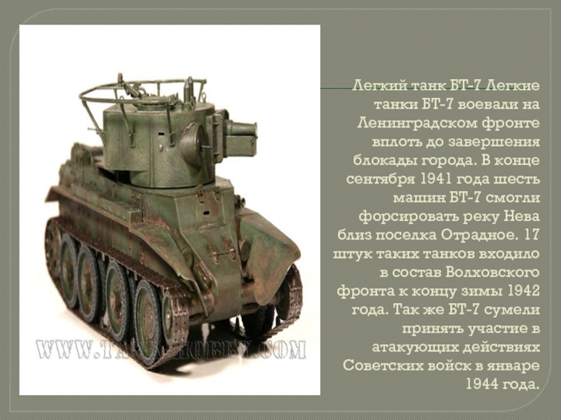Слайд 9Легкий танк БТ-7 Легкие танки БТ-7 воевали на Ленинградском фронте вплоть