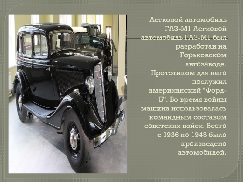 Слайд 6Легковой автомобиль ГАЗ-М1 Легковой автомобиль ГАЗ-М1 был разработан на Горьковском автозаводе.