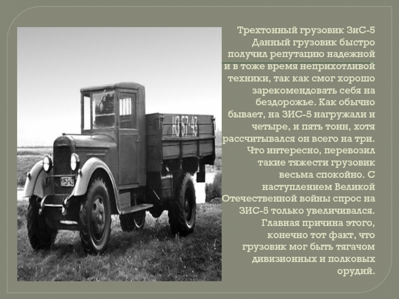 Слайд 7Трехтонный грузовик ЗиС-5 Данный грузовик быстро получил репутацию надежной и в