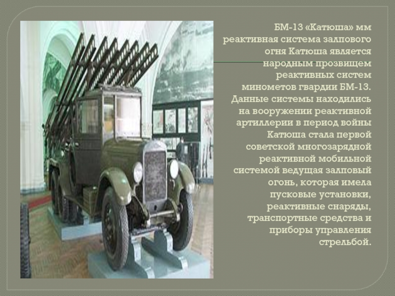 реактивных систем минометов гвардии БМ-13. Данные системы находились на вооружении реактивной артиллерии в период войны Катюша стала первой советской многозарядной реактивной мобильной системой ведущая залповый огонь, которая имела пусковые установки, реактивные снаряды, транспортные средства и приборы управления стрельбой.
