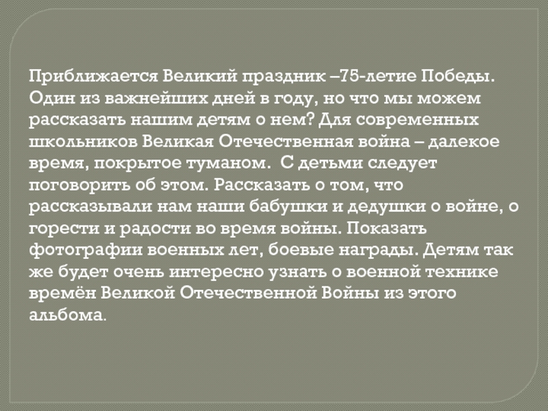 но что мы можем рассказать нашим детям о нем? Для современных школьников Великая Отечественная война – далекое время, покрытое туманом. С детьми следует поговорить об этом. Рассказать о том, что рассказывали нам наши бабушки и дедушки о войне, о горести и радости во время войны. Показать фотографии военных лет, боевые награды. Детям так же будет очень интересно узнать о военной технике времён Великой Отечественной Войны из этого альбома.